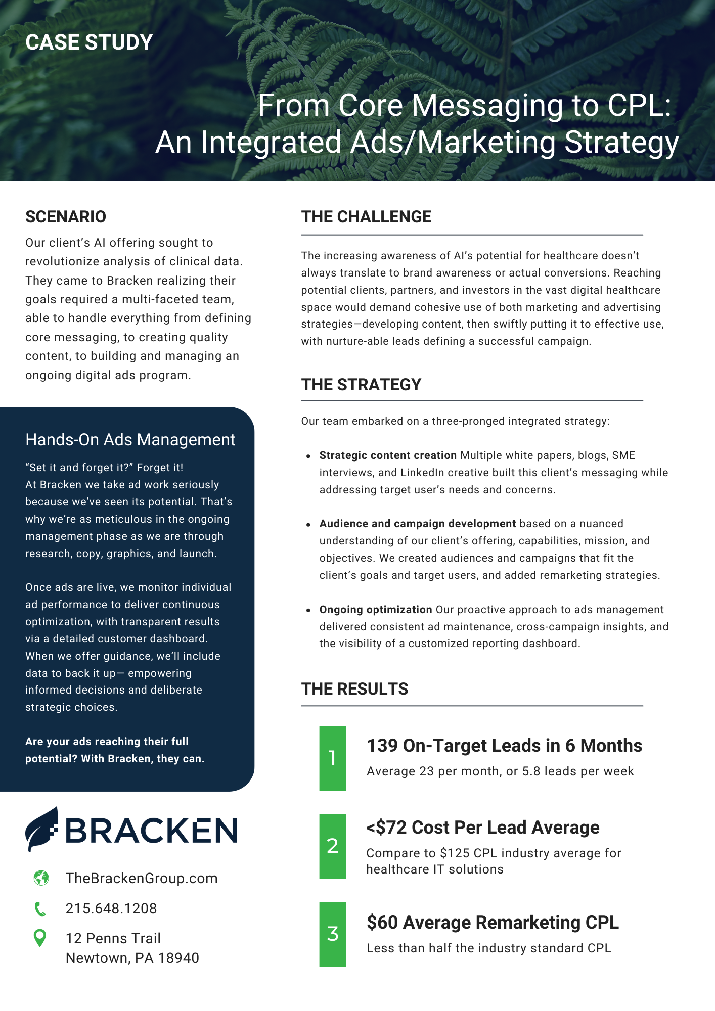 Our client’s AI offering sought to revolutionize analysis of clinical data. They came to Bracken realizing their goals required a multi-faceted team, able to handle everything from defining core messaging, to creating quality content, to building and managing an ongoing digital ads program.